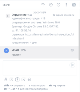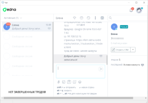 - Будет открыто диалоговое окно Чат EDNA. В чате будут отображаться данные клиента и сообщение от клиента.