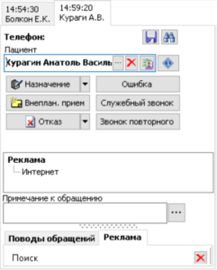 - В списке пациентов в картотеке будет выбран пациент (клиент), если его телефон найден в системе.
